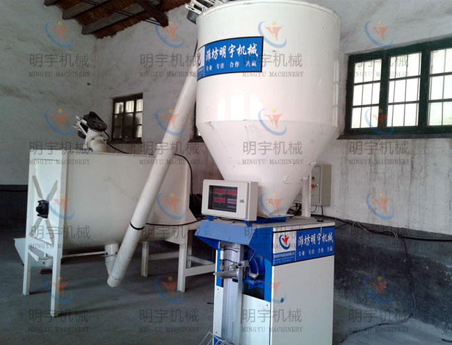 工人将原料依次投入加料斗内,由螺旋上料机将物料输送到卧式无重力搅拌机,混合2-3分钟(根据不同物料混合时间略有差别)。混合好的物料经出料螺旋蛟龙输送到成品仓,成品仓下部配全自动称量包装机,将混合的成品装袋包装。在包装过程中,可以重复上面投料、搅拌等过程,以实现流水线作业,提供生产效率。